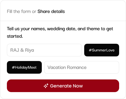 Whether you're crafting your perfect card or generating hashtags, our all-in-one platform simplifies every creative wedding task with smart automation and beautiful results.